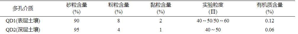 本研究選用的兩種多孔介質分別為QD1(表層20~40cm土壤)和QD2(地下50~100cm深層土壤),均采自青島市嶗山區某農田。經過自然風幹後,將其篩分為40~50目和50~60目。實驗選用土壤中的金屬氧化物含量均較低,主要差異為有機質含量。土壤樣品的性質見表1。