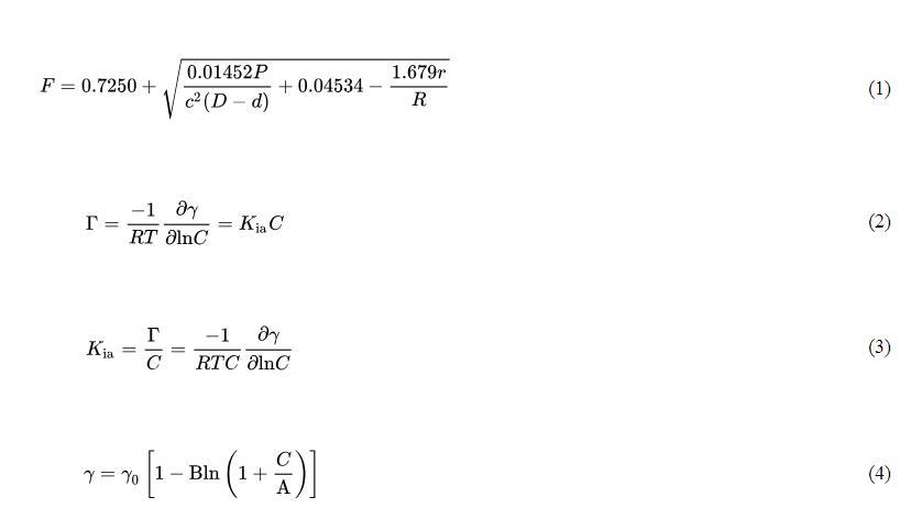 實際表麵張力(γ)由儀器表麵張力讀數(P)、校正因子(F)和實驗相關常數相乘得到。校正因子計算如公式(1)所示;氣-水界麵吸附係數通過Gibbs吸附等溫方程得到,見公式(2)和公式(3);將Szyszkowski方程應用於表麵張力數據,見公式(4),該方程提供了一種計算數值的統一方法。