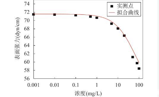 在0.01mol/L氯化鈉溶液中測量所得的6∶2氟調磺酸表麵張力如圖1所示,圖中實心點表示同一濃度下表麵張力的實際平均值,曲線是基於Szyszkowaki方程擬合所得。利用該方程擬合的相關參數A和B的值分別為12.70和0.075。實驗結果顯示實測數據點與擬合曲線偏移量較小,這證實了Szyszkowaki方程對本實驗體係的表麵張力數據具有良好的擬合效果。