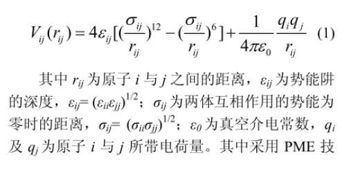 在計算過程中,綜合考慮了係統內分子間非鍵結作用力(範德華力、庫倫靜電力)及分子內鍵結作用力(鍵拉伸和鍵彎曲)。分別采用Lennard-Jones勢能函數模擬範德華力,庫侖定律模擬庫侖靜電力,具體分子間勢能函數如式(1)所示