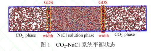 本文計算中,水分子選擇柔性F3C模型,CO2選擇柔性EPM2模型,鹽離子采用Chandrasekhar等開發的模型。應用MD軟件Gromacs4.5並采用周期性邊界條件進行計算,所建立的橫截麵4 nm×4 nm的計算域示於圖1。計算域中間區域為鹽水,包括4323個水分子、147個Na+和147個Cl-,對應鹽度為1.89 mol·L-1,兩側分別為732個CO2分子。利用Berendsen方法來實現溫度和壓強的設定。由於係統在NPzT係綜下20 ns達平衡態,故模擬時間運行30 ns,選取最後5 ns為有效數據進行分析。