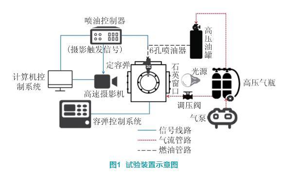 圖1為試驗裝置示意圖,主要由計算機控製係統、噴油係統控製器、高壓燃料供給係統、定容彈係統、高速攝像裝置等組成。