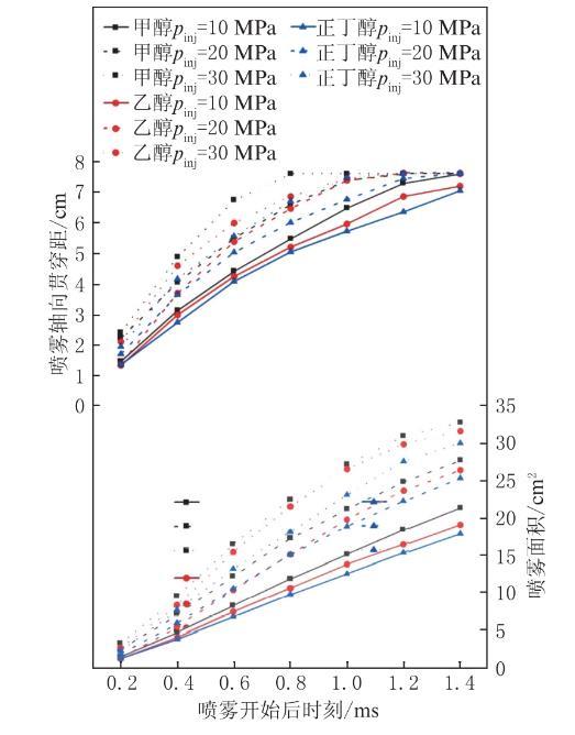 圖2為3種醇類燃料在背壓0.1 MPa、環境溫度20℃時,不同噴射壓力下噴霧開始後時刻0.2至1.4 ms內的噴霧軸向貫穿距和噴霧麵積的變化,其中pinj定義為噴射壓力。