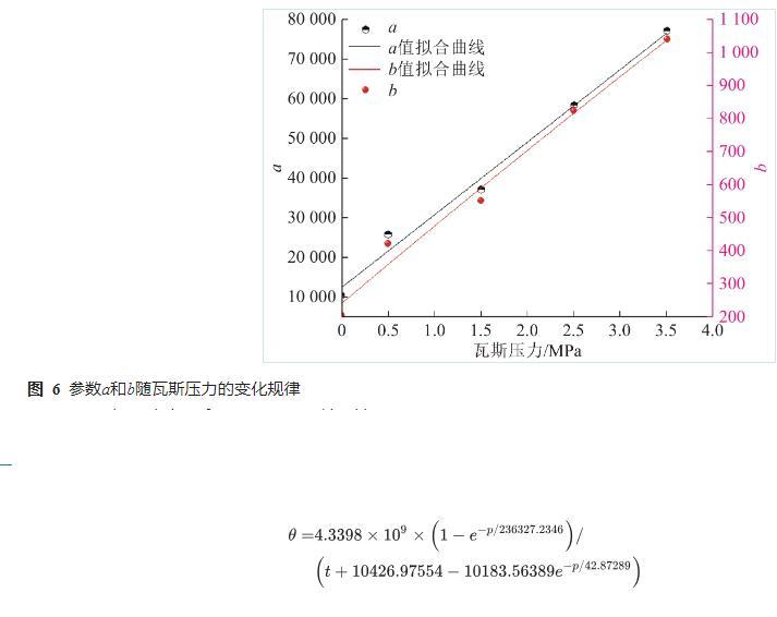 由圖5可知,同一瓦斯壓力下,接觸角隨著時間的增加而逐漸減小,說明水分在含瓦斯煤表麵發生了浸潤現象。接觸角θ與時間t滿足的關係,參數a和b的值如圖6所示。參數a與壓力p滿足的關係,參數b與壓力p滿足的關係。接觸角與壓力及時間的關係如式(4)所示。