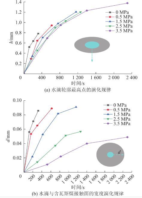 圖9水滴輪廓最高點及水滴與含瓦斯煤接觸麵的寬度演化規律