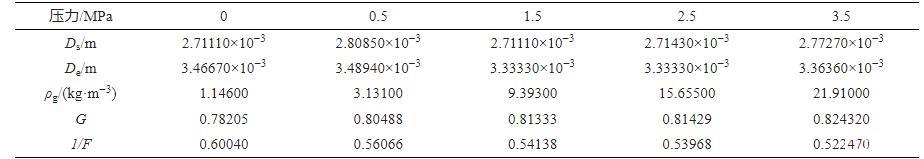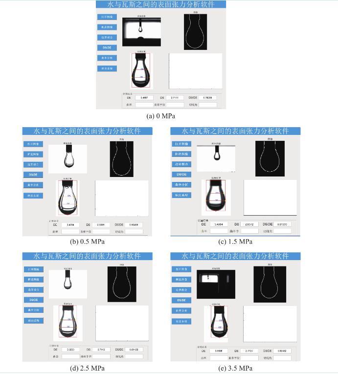 采用團隊自開發的水與瓦斯之間的表麵張力分析軟件對不同瓦斯壓力條件下的水滴形貌(圖3)進行分析,即可獲得式(1)中的Ds及De。F為G修正後的形狀因子,F通過查表及插值法獲得,式(1)中的參數見表1,將表1中的參數帶入式(1)及式(2),即可獲得不同瓦斯壓力條件下水與瓦斯之間的表麵張力(圖4)。