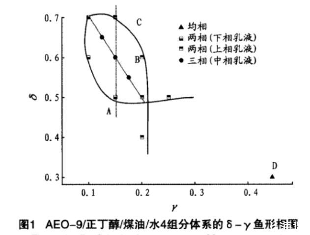四組分體係水(W)+油(O)+表麵活性劑(S)+醇(A)中,α為油在二元體係水+油中的質量分數,表示為α=O/(W+O);δ為醇在混合表麵活性劑中的質量分數,即δ=A/(S+A);γ為混合表麵活性劑在整個體係中的質量分數,即γ=(S+A)/(W+O+S+A)。通過變換α、γ、δ值,配製不同組成的乳液,靜置後記錄各乳液的相行為,繪製成魚形相圖。