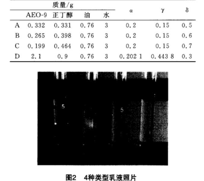 由圖1可見,在所配製的乳液中,既有均相乳液,也有兩相(上相、下相)乳液,同時有三相(中相)乳液。在選擇典型體係時,應體現出全麵性,即以上4種類型乳液都涉及到,同時應考慮到漸變性,即固定某個變量(此處固定γ),一種相態向另一種相態轉變。由此,選出其中4組:A(下相乳液)、B(中相乳液)、C(上相乳液)、D(均相乳液),A、B、C、D的組成如表1所示,形成的乳液照片如圖2所示。分別將乳液部分分離出來,稀釋成質量分數為0.1%、0.3%、0.5%、1.0%的微乳液。