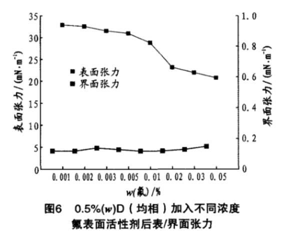 0.5%(w)D(均相)加入不同濃度氟表麵活性劑後表/界麵張力見圖6。