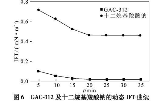 由圖6可知,羧酸鹽Gemini表麵活性劑GAC-312在20 min內可將油水界麵張力降至7.6×10-3mN/m(超低界麵張力級別),相同條件下,十二烷基羧酸鈉將界麵張力僅降低至4.54×10-1mN/m,GAC-312界麵活性優異。GAC-312能夠具備優秀的界麵活性主要是由於羧基和水之間具有較強親和力,導致GAC-312可以更快、更好地吸附在界麵上,其分子在油/水界麵上的排列更緊密,降低油水界麵張力的能力更強。