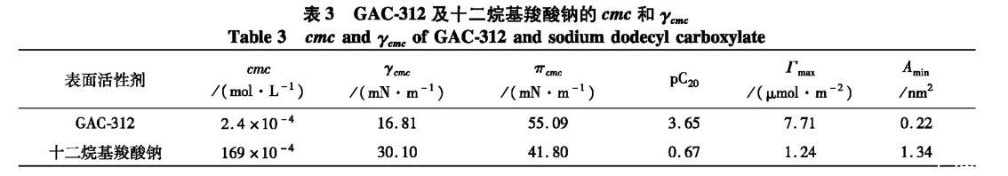 由圖5可知,隨著溶液濃度的增大,GAC-312及十二烷基羧酸鈉溶液的表麵張力逐漸降低,當濃度達到某點後,溶液的表麵張力變化趨於穩定,該點對應的濃度即為GAC-312及十二烷基羧酸鈉的臨界膠束濃度(cmc)。GAC-312及十二烷基羧酸鈉的cmc及相關性能參數見表3。