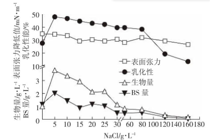 圖6 NaCl濃度對147細菌生長以及生物表麵活性劑產量的影響