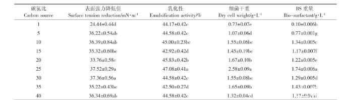 表5碳氮比對147細菌生長以及生物表麵活性劑產量的影響