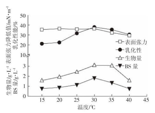 圖4溫度對147細菌生長以及生物表麵活性劑產量的影響