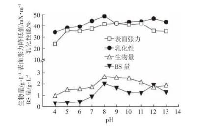 圖5 pH對147細菌生長以及生物表麵活性劑產量的影響