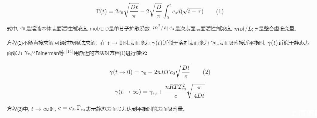 表麵活性劑是一種能夠在界麵吸附,降低界麵張力的物質。在界麵快速形成過程中,如紡織品、紙和其他基質的快速潤濕,液體的發泡,用靜態(平衡)表麵張力不能全麵表征表麵活性劑快速降低界麵張力的能力,而動態表麵張力能更好地表征表麵活性劑在上述過程中所起的作用。1946年Word和Tordai研究陰離子表麵活性劑的界麵吸附行為,提出了描述氣/液界麵吸附量隨吸附時間變化的Word-Tordai方程;隨著各種檢測手段的開發應用,20世紀90年代起,關於表麵活性劑的動態表麵張力及其在氣/液界麵吸附行為又引起該領域研究者的關注。Eastoe和Dalton通過研究雙子型非離子表麵活性劑在空氣——水界麵的吸附機理,驗證了Word和Tordai提出的擴散控製吸附和混合動力控製吸附模型適用於該體係。柴金玲等利用Word-Tordai方程得到烷基聚葡糖苷(APG)在不同濃度、溫度時的擴散係數和表觀擴散係數,並發現鹽對吸附行為有明顯影響;劉傑等通過Rosen模型研究膠束對APG的動態表麵張力的影響,發現各項參數的變化趨勢不會因為膠束的形成而受到影響。