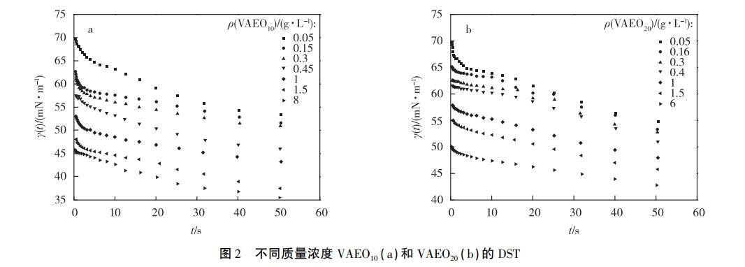 先測定不同質量濃度表麵活性劑室溫25℃時的靜態表麵張力,通過γ-lgρ曲線求得VAEO{}_{10}和VAEO20的臨界膠束濃度(cmc)分別為0.6和0.7g/L(0.83和0.62mmol/L),臨界表麵張力(gamma_{text{cmc}})分別為32.9和39.8mN/m.動態表麵張力(DST)試驗的表麵活性劑質量濃度選擇在10-1——102cmc之間。不同質量濃度VAEO{}_{10}和VAEO{}_{20}在25℃下的DST測定結果如圖2所示。