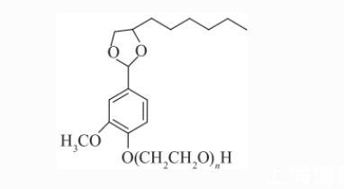 香蘭素基聚氧乙烯醚left(VAEO_n,n=10right.、20,由香蘭素與辛二醇在磷酸催化下生成香蘭素辛二醇縮醛,再與環氧乙烷開環加成聚合反應得到,純度95%),其EO聚合度呈泊鬆分布。