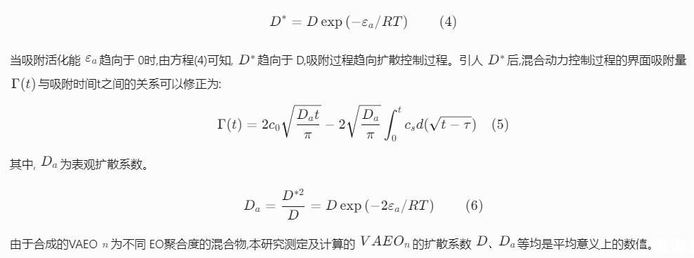 擴散控製的吸附過程,表麵活性劑分子由濃度差驅使進入新表麵,不存在吸附勢壘。Word-Tordai方程描述了界麵吸附量Г(t)與吸附時間t的關係:Г(t)=2c0Dtπ-2Dπ∫t0csd(t-τ)(1)式中,c0是溶液本體表麵活性劑濃度,mol/L,D是單分子擴散係數,m2/s,cs是次表麵表麵活性劑濃度,mol/L,τ是整合虛設變量。方程(1)不能直接求解,可通過極限法求解。在t→0時,表麵張力γ(t)近似於溶劑表麵張力γ0,表麵吸附接近平衡時,γ(t)近似於靜態表麵張力γeq.Fainerman等用漸近的方法對方程(1)進行轉化:γ(t→0)=γ0-2nRTc0Dtπ(2)γ(t→∞)=γeq+nRTГ2eqcπ4Dt(3)方程(3)中,t→∞時,c=c0,Γeq表示靜態表麵張力達到平衡時的表麵吸附量。混合動力擴散吸附是指表麵活性劑分子從本體擴散到次表麵仍然遵循擴散機理,但從次表麵層擴散到表麵層時需克服一定的勢壘。Liggieri和Ravera[15,16]提出,次表麵層中的分子,隻有能量大於吸附活化能εa才能被吸附到表麵,已吸附的分子,隻有能量大於解吸活化能εb才能被解吸。以Word-Tordai方程為基礎,引入矯正擴散係數D∗。矯正擴散係數D∗和擴散係數D關係定義為:D∗=Dexp(——εa/RT)(4)當吸附活化能εa趨向於0時,由方程(4)可知,D∗趨向於D,吸附過程趨向擴散控製過程。引入D∗後,混合動力控製過程的界麵吸附量Г(t)與吸附時間t之間的關係可以修正為:Г(t)=2c0Datπ-2Daπ∫t0csd(t-τ)(5)其中,Da為表觀擴散係數。Da=D∗2D=Dexp(——2εa/RT)(6)由於合成的VAEOn為不同EO聚合度的混合物,本研究測定及計算的VAEOn的擴散係數D、Da等均是平均意義上的數值。