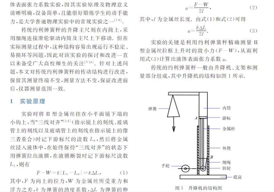 傳統約利彈簧秤的升降主尺刻在內筒上,采用細繩連接滑輪驅動內筒及主尺上下移動。但在實際測量過程中,這種結構容易出現運行不穩定、易損壞等問題,因此對該實驗的探討和改進一直以來備受廣大高校師生的關注。針對上述問題,本文對傳統約利彈簧秤的傳動結構進行改進,保留其測量終端不變,測量方法不變,保證改進前後,儀器測量範圍一致。