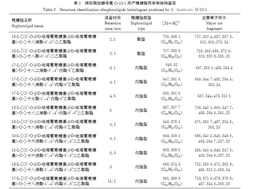 表3球擬假絲酵母菌O-13-1所產槐糖脂同係物結構鑒定