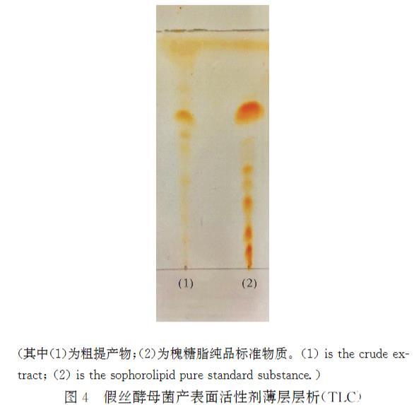 圖4假絲酵母菌產表麵活性劑薄層層析(TLC)其中(1)為粗提產物;(2)為槐糖脂純品標準物質。