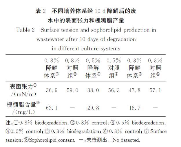 表2不同培養體係經10d降解後的廢水中的表麵張力和槐糖脂產量
