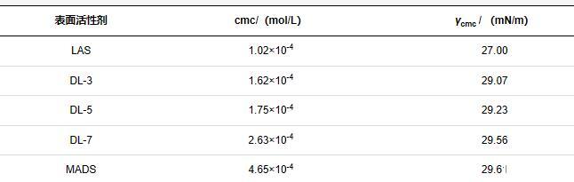 表2給出了混合磺酸鹽的臨界膠束濃度(cmc)和cmc時的表麵張力(γcmc),可以看出,LAS展現出最佳的表麵活性,隨著混合磺酸鹽中MADS含量的增加,cmc和γcmc呈增加趨勢,這是由於MADS分子中含有2個磺酸基團,親水性強,分子間靜電斥力大,不利於膠束的形成,且在氣/液排列時分子疏鬆,裸漏的-CH3密度小,即γcmc較高。