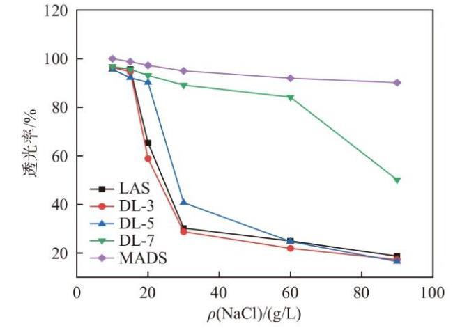 在許多工業應用中,水中含有大量的鹽類,例如在石油天然氣開采、海洋設備清洗或汙水處理等場景中[2,7]。耐鹽型表麵活性劑能夠保持在高鹽環境下的化學穩定性,避免沉澱或失效,確保其清洗能力不受影響,因此探究表麵活性劑的耐鹽性有重要意義。圖3給出了LAS、DL-n、MADS的耐鹽性透光率圖,可以看出,LAS的耐鹽性最差,20 g/L NaCl時溶液渾濁,而MADS的耐鹽性最好,隨著混合磺酸鹽中MADS含量的增加,混合磺酸鹽的耐鹽性呈升高趨勢,說明MADS含量的提高有利於提高耐鹽性,這可能是由於無機鹽對陰離子表麵活性劑的作用體現在離子頭基水化層的破壞作用,MADS分子中的雙磺酸結構電荷密度大,屏蔽了NaCl的作用。