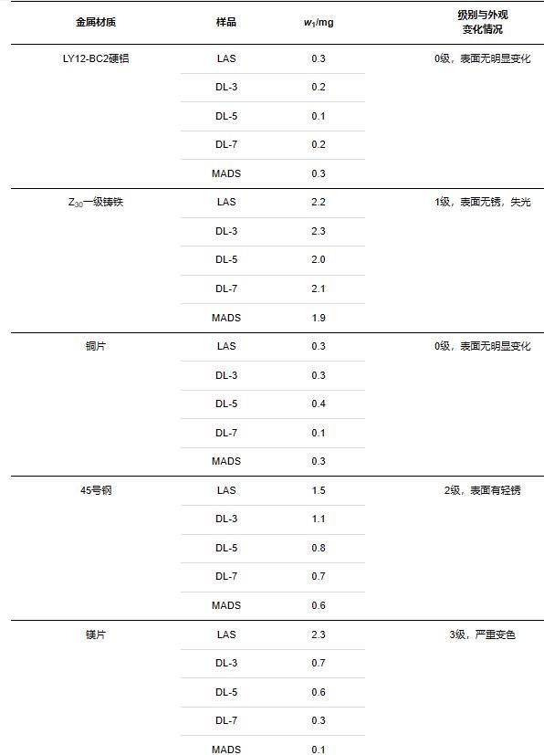 表麵活性劑在使用過程中難免會接觸到金屬設備及容器,存在潛在的腐蝕問題[11]。本研究選用LY12-BC2硬鋁、Z30一級鑄鐵、銅片、45號鋼、鎂片這5種不同的金屬試片來模擬不同的金屬環境,對LAS、DL-n係列、MADS表麵活性劑溶液進行金屬腐蝕性測試。通過觀察試片外觀變化以及腐蝕量計算來確定金屬腐蝕性級別。