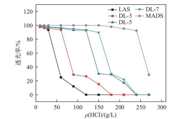 在許多工業過程中,表麵活性劑會接觸到酸性環境,例如石油開采中的酸化處理、金屬表麵處理、酸性清洗劑等[8-10]。研究表麵活性劑的耐酸性可以確保這些產品在酸性條件下仍能保持穩定性和功能性,從而避免在苛刻條件下失效或分解。磺酸基團為C-S鍵,與硫酸鹽類表麵活性劑(如AES)相比,在酸性條件下較穩定,不易分解。圖4給出了LAS、DL-n、MADS的耐酸性透光率圖,可以看出,隨著混合磺酸鹽中烷基二苯醚含量的增加,耐酸性逐漸增加。LAS耐酸性最差,MADS的耐酸性最好,在270 g/L時渾濁。混合磺酸鹽在結構上並沒有發生破壞,發生渾濁是由於聚集體形態發生了變化,從而體現出溶液渾濁的現象。