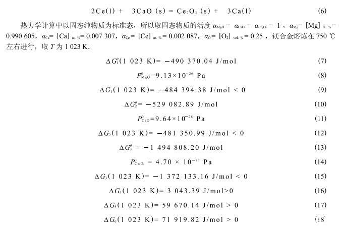 但由於Ce元素在合金熔體中是分布不均勻的,如圖6所示的點能譜分析可以看出,Ca和Ce在此處的相對原子分數分別達到了2.50%和3.34%.按照此處的原子活度計算得到:Delta G_4(1023~K)=-12885.19~kJ/mol<0,Delta G_5(1023~K)=17418.58~kJ/mol>0,Delta G_6(1023~K)=56138.14~kJ/mol>0,在此處式(4)中的反應可以自發地進行.由此可知,式(4)、(5)、(6)的反應在局部元素分布不均勻的區域有可能發生置換反應.