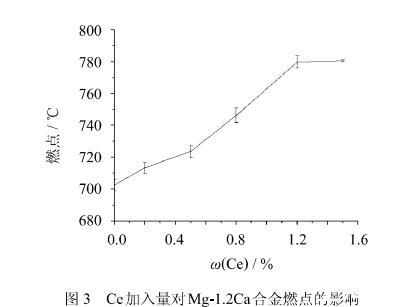 1)在一定範圍內,隨著Ce含量的增加,合金的燃點也隨之提高,當Ce含量達到1.2%時,合金的燃點能達到780℃。