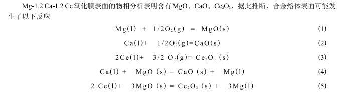 這種氧化膜結構的明顯不同可以很好的解釋阻燃效果之間的差異.歸其原因,主要是由於,在沒有添加任何Ce元素的情況下,不論形成的MgO薄膜還是CaO薄膜,由於其致密度較低,因此不能夠完全阻止氧的進一步擴散;相反,在添加了較多元素的Ce後,不但可以形成更加致密的複合的氧化膜,而且Ce2O3比較致密,不但可以很好的隔絕氧的進一步擴散,而且還能夠添補許多裂紋,因此,具有很好的阻燃效果.