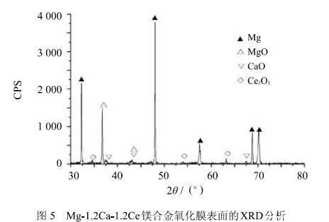 從式(9)、(12)、(15)可知,從熱力學上講,在氧化開始時Mg、Ca和Ce 3種元素均有可能發生氧化;從式(16)、(17)、(18)可以看出,由於活度的影響,式(4)、(5)、(6)所述的置換反應在元素分布均勻的情況下不可能發生;從式(8)、(11)、(14)各氧化物分解壓的計算,MgO、CaO和Ce_2 O_3分解壓的大小順序為:PMgO^0>PCaO^0>PCe,O^0.此外,對氧化膜進行X射線衍射結果表明(圖5),氧化膜中並未出現新的複雜氧化物,可見MgO、CaO和Ce_2 O_3是互不固溶的.按熱力學規律,此時合金將分層氧化,即氧化膜外層氧壓高生成的氧化物其分解壓也大,氧化膜內層氧壓低生成的氧化物其分解壓也小。所以Mg-1.2 Ca-1.2 Ce來說,將按照這樣的順序來氧化:最外層是MgO,其次是CaO,最內層是Ce_2 O_3.至此,初始的保護性氧化膜形成.