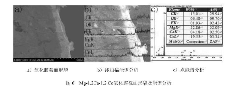 4)通過氧化膜的截麵檢測和熱力學計算分析得出Mg-1.2Ca-1.2Ce的形成的氧化膜大致分為3層:外層是MgO,中間層是CaO,內層是Ce2O3。