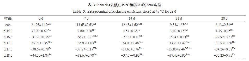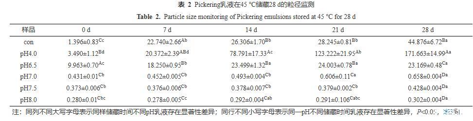由圖8可知,當儲藏14 d時,Con、pH4.0的乳液均出現大麵積的油滴聚集,pH6.5的乳液出現局部小聚集,而pH7.0~8.0的乳液微觀結構顯示其分布仍然均勻,無任何油滴聚集現象。當儲藏28 d後,Con、pH4.0、pH6.5的乳液中聚集程度明顯加強,pH7.0的乳液也有較微弱的局部小聚集現象;而pH7.5與pH8.0的乳液仍保持良好的分布狀態,這與圖7的視覺直觀圖、表2粒徑監測和表3電位監測的結果保持一致。CLSM的結果再次證實PPP-NP穩定的乳液酸性條件下的長期穩定性較差,在中性和堿性條件下有著更好的乳液穩定性。這一結果與He等的結果相似,其所製備的樣品同樣在堿性條件下穩定性更高。
