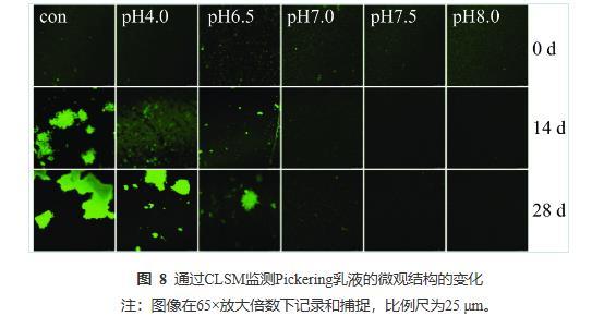共聚焦激光掃描顯微鏡(Confocal laser scanning microscope,CLSM)常用於分析乳液的微觀結構,它可以內在地反映乳液顆粒的尺寸分布、分散性和穩定性。不同pH下形成的PPP-NP穩定的Pickering乳液如圖8所示。油滴被尼羅紅染色顯示綠色,因此綠色區域代表油滴。由於乳液液滴的粒徑較小,因此在CLSM下顯現出滿屏的綠色小點。