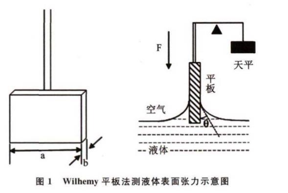 如圖1,將一塊長度為a、厚度為b的平板(如鉑金板)部分浸入待測液體中,板四周會受到液體向下的表麵張力的作用,平板另一端連接天平,由天平測量平板所受垂直向下的合力。平板垂直向下的合力等於平板的重力與表麵張力在垂直方向的分量之和,如式(1)。在式(1)中平板的重力已知,如液體與平板的接觸角已知,則可計算得到液體的表麵張力。