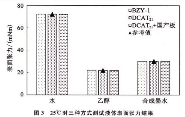 使用BZY-1宅男视频在线网站(原配國產鉑金板)、宅男视频在线网站(原配進口鉑金板)和宅男视频在线网站(選配國產鉑金板)對水、無水乙醇、合成墨水進行表麵張力測試,測試結果如圖3所示。