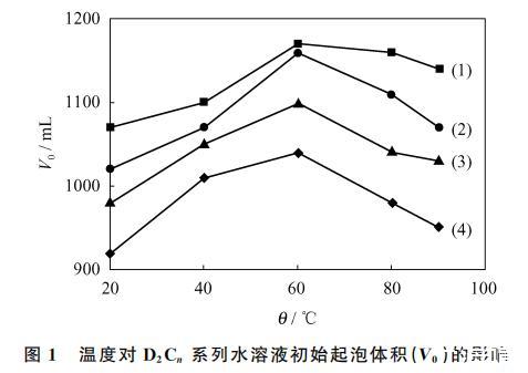 圖1 溫度對 D2Cn 係列水溶液初始起泡體積(V0)的影響