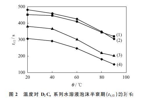 圖2 溫度對D2C係列水溶液泡沫半衰期(t1/2)的影響