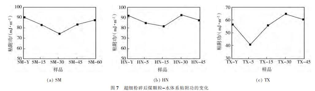 圖7超細粉碎後煤顆粒-水體係粘附功的變化