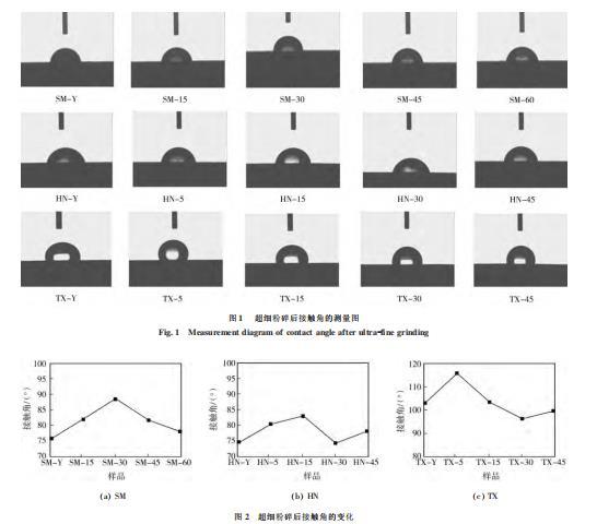 3種煤樣超細粉碎後的接觸角變化見圖1、2。可以看出,變質程度高的太西煤的接觸角在100°左右波動,明顯大於神木不粘煤和淮南氣煤的接觸角(在75°左右變化)。還可以看出,濕法超細粉碎後3種變質程度煤樣的接觸角的變化規律相似,在短時間的濕法超細粉碎後,接觸角變大,疏水性增強,隨著超細粉碎時間的延長,接觸角減小。總體來看,神木煤與淮南煤在濕法超細粉碎後的接觸角大於超細粉碎前的,說明對於低階煤,在濕法超細粉碎後,煤顆粒表麵的疏水性在一定程度上有所增強,潤濕性減弱;太西煤在濕法粉磨30、45min後的接觸角小於超細粉碎前的,由此可得,對於高階煤,長時間進行濕法超細磨礦會劣化煤顆粒表麵的疏水性。