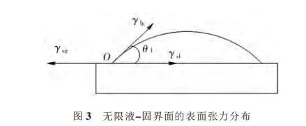朱定一等通過設計一種在有限液-固界麵上的潤濕性表征體係,推導出在無限液-固界麵係統中固相表麵張力和液-固界麵張力的計算方法,並且通過潤濕角實驗和計算,證實了在接觸角較大時,該理論對固相表麵張力的一致性。圖3所示為液相在無限固體平麵上的潤濕表征係統。其中γsl、γlg、γsg分別表示固-液、液-氣、固-氣3個界麵上的表麵張力,O為氣-液-固三相接觸點,θ1為氣-液界麵的切線與固-液界麵的夾角,即接觸角。當達到平衡時,作用於潤濕周邊的3個表麵張力在水平方向的分力必為0,此時的平衡狀態方程,即Young方程為