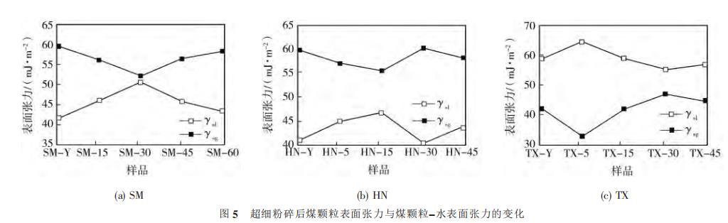 圖5超細粉碎後煤顆粒表麵張力與煤顆粒-水表麵張力的變化