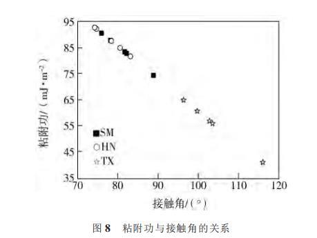 將接觸角θ與γlg代入式(9)可得煤顆粒與水的粘附功,結果見圖7。由圖可知,隨著超細粉碎時間的延長,煤-水體係的粘附功的變化趨勢與接觸角的變化趨勢相反。3種煤樣的接觸角與粘附功的關係見圖8。由圖可知,隨著接觸角的增大,煤-水界麵的粘附功減小,說明粘附功越小,煤顆粒的潤濕性越差。粘附功也可作為衡量煤顆粒潤濕性的指標。